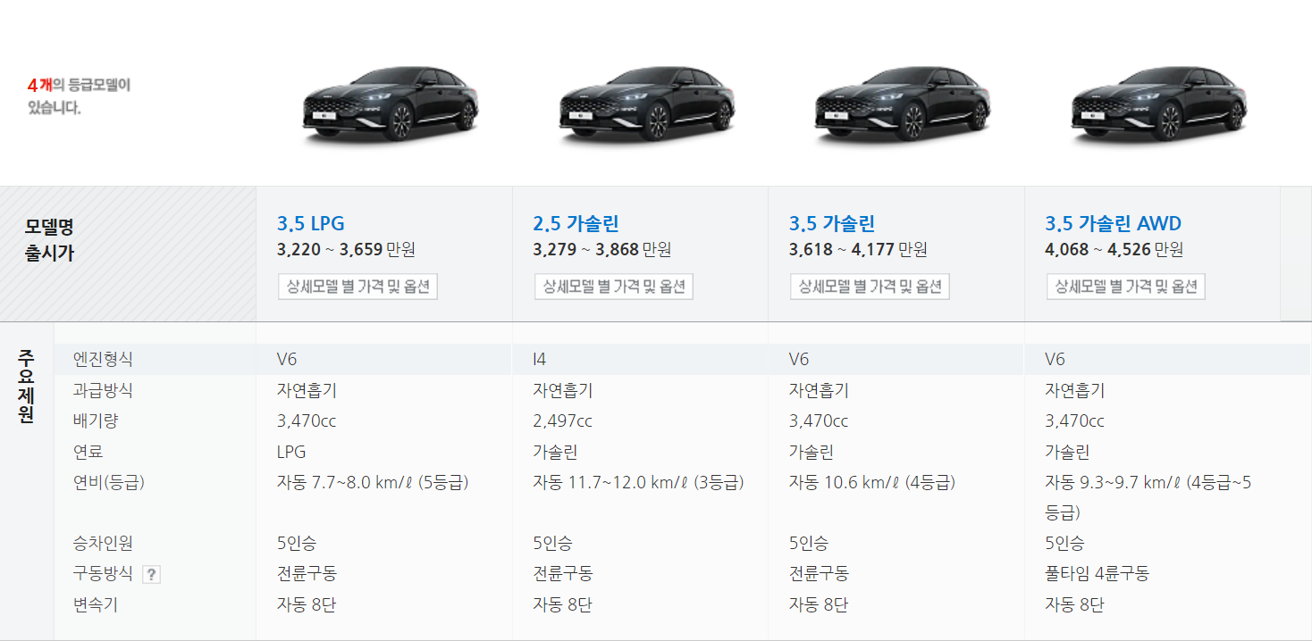 기아는 K8을 2.5 가솔린, 3.5 가솔린, 3.5 LPI 3가지 엔진으로 운영하며. 1.6 가솔린 터보 하이브리드는 다음 달 중 출시 예정입니다. (이해가 쉽도록 그렌저 차량과 비교를 하여 설명드리겠습니다)