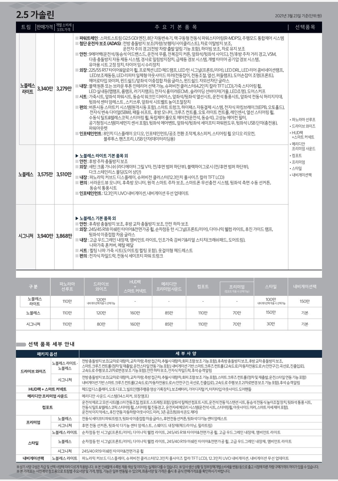 2.5 가솔린 노블레스 라이트 3,279만 원 , 노블레스 3,510만 원, 시그니처 3,868만 원, 3.5 가솔린 노블레스 라이트 3,618만 원, 노블레스 3,848만 원, 시그니처 4,177만 원, 플래티넘 4,526만 원, 3.5 LPI 프레스티지 3,220만 원 , 노블레스 3,659만 원입니다(※ 개별소비세 3.5% 기준)
