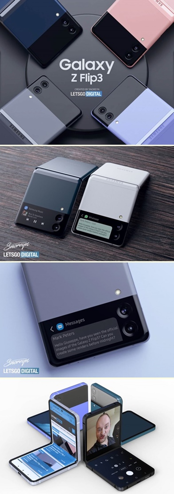- 색상: 최근 유출된 자료에 따르면 갤럭시 Z플립 3의 색상은 바이올렛, 그린, 블랙, 베이지 4가지의 색이 유출되었는데, 블랙, 화이트, 다크 블루, 다크 핑크, 라이트 퍼플, 그린, 베이지, 매트 그레이 총 8가지의 색상으로 출시된다는 소문입니다. 그리고 지난 모델들에서 화려함을 강조한 원색 컬러를 강조했다면, 이번에 출시될 신제품은 투톤 컬러를 적용하여 분위기를 확 바꾸면서 특정 고객을 저격한 디자인이 아닌, 누구에게나 호 불가 없을 디자인이 될 전망입니다.